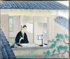 本作品は、宣長の書斎「鈴屋」で執筆に余念のない宣長を描いています。「鈴屋」は天明2年自宅を増築した、2階にある4畳半の小部屋で、研究に疲れると様々な鈴を鳴らして楽しんだといわれています。大きな窓は、御簾を上げる形のものです。
